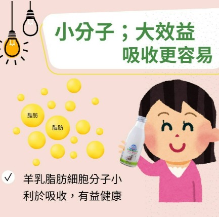 肪酸以長鏈居多)分子結構較小,也因此較容易吸收,同时造就了羊乳對人體健康的很好的維性;對於喝牛奶容易不適者,可以試試看改喝羊奶