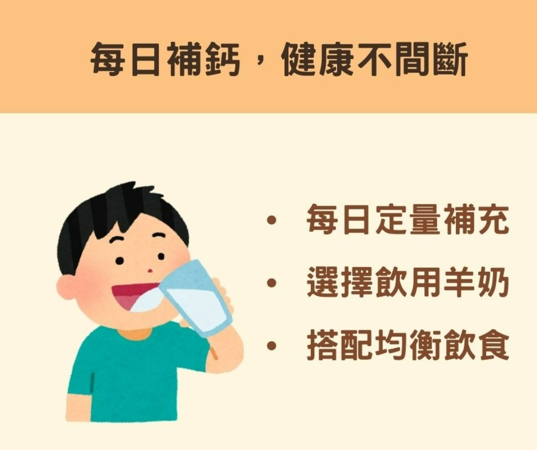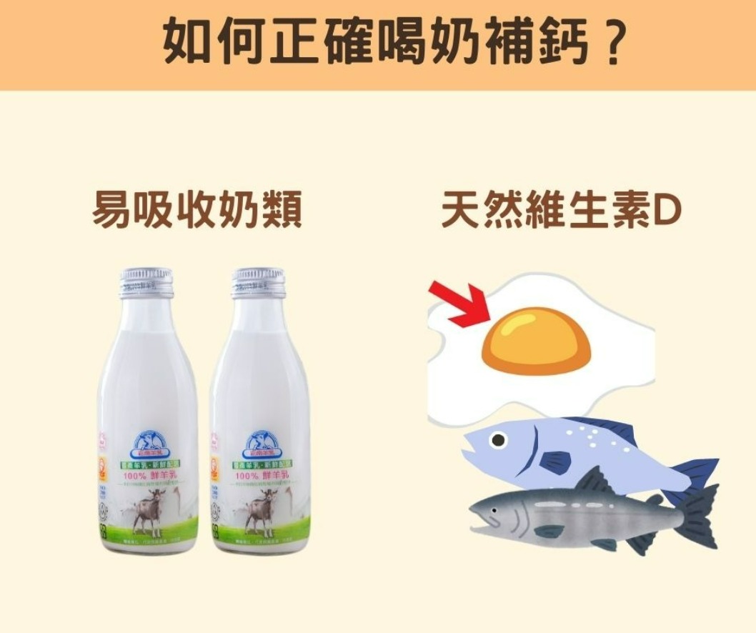 補鈣的天然首選=>羊奶。依研究顯示,羊奶的鈣吸收率比牛奶高約 13%;羊奶因脂肪顆粒更小、蛋白結構更細緻,能被身體更有效地吸收;維生素 D 是鈣吸收的好幫手,建議日常攝取含維生素 D 的食物,如蛋黃、深海魚,或每日曬太陽 10~15 分鐘,幫助鈣質更好吸收利用。