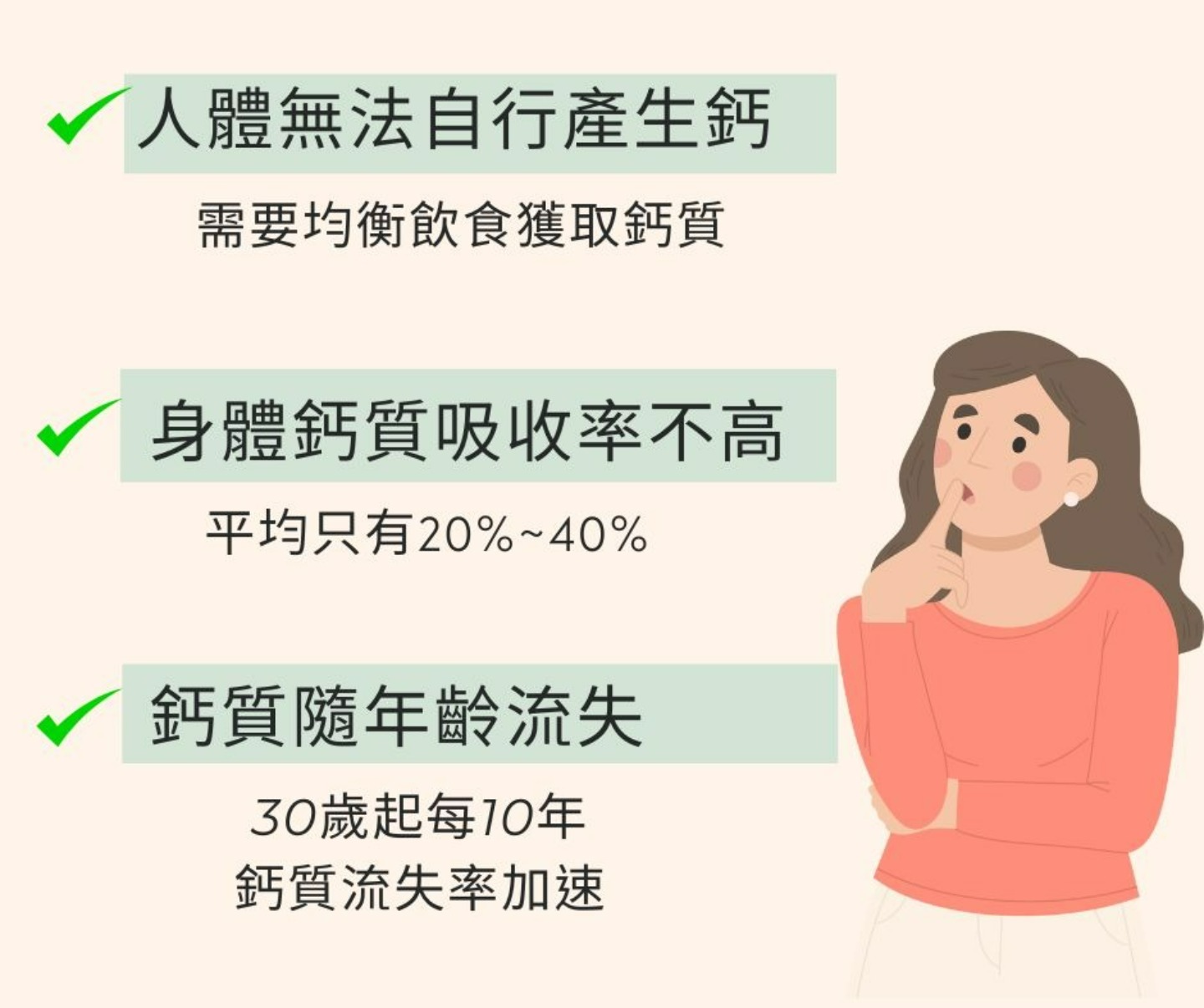 鈣質是維持健康的關鍵,人體無法自行生產鈣質,因此應透過均衡飲食來獲取鈣質。其實人體對鈣的吸收率並不高,平均只有 20%~40%,而且隨著年齡增加鈣質更容易流失。若想要有效補鈣,不僅需要攝取足量的鈣質,更要注意如何提高飲食中鈣質的吸收率,並且透過正確的生活習慣來延緩鈣質流失。