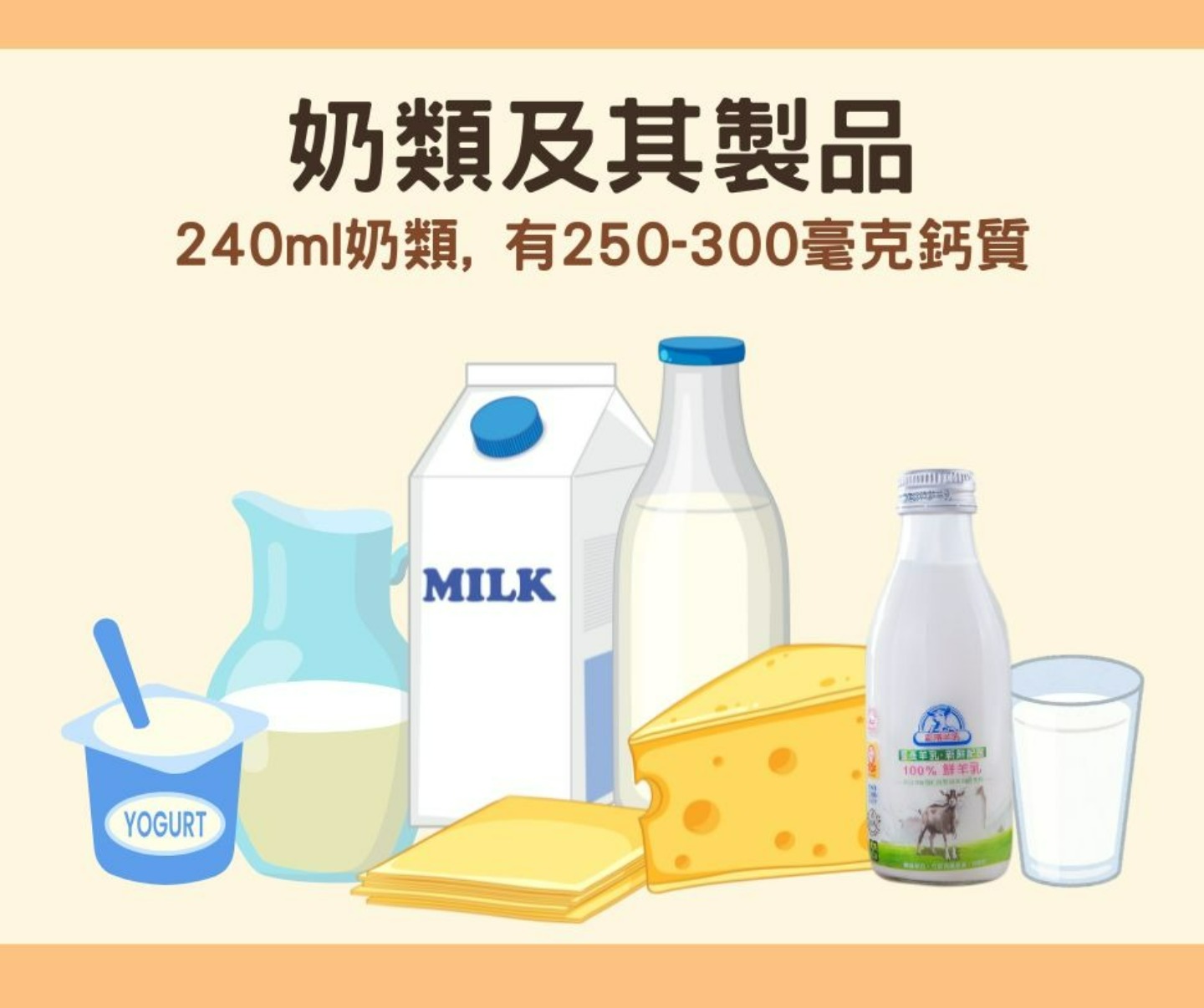 奶類是補充鈣質不錯的選擇,每240毫升的奶類可提供250-300毫克的鈣質,可達到成人一日1/4的鈣建議攝取量。 無糖優酪乳、起司也是含鈣的食品,可適當加入飲食中。