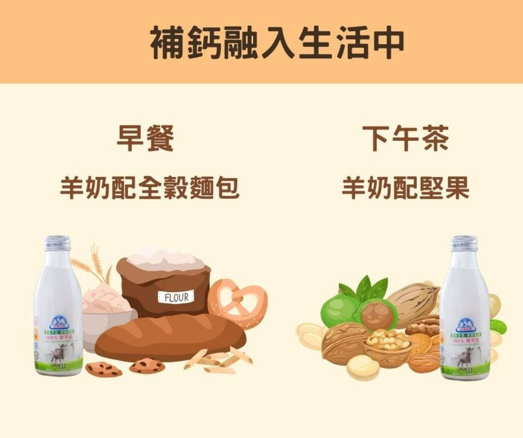 早餐加分:搭配一杯羊奶與全穀麵包,讓一天的開始營養又均衡。下午茶選擇:用羊奶搭配適量堅果,補鈣又美味。