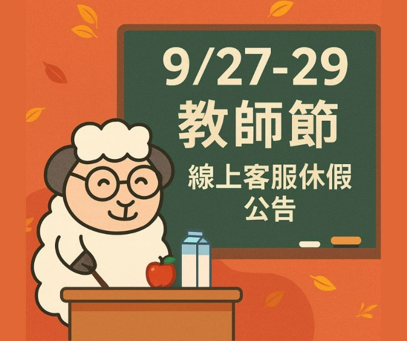 📣 📣教師節連假,線上客服暫停服務公告📣 📣 ➡️ 9/27-9/29 三天線上客服暫停回覆訊息 ➡️ 羊乳配送時間,請洽各地經銷商 ⛔ 提醒您 ⛔ 📌有任何訂單、配送相關訊息📌 ❣️請務必‼‼ 【於9/26中午前】與各地經銷商聯繫喔! ❣️ 祝福連假愉快,有開心假期~😂 🐑嘉南羊乳關心您!❤ ✅加入官方Line@訂羊訂購及客服,變的很方便😉:加入官方Line點請我 📣更多產品資訊 參見官網:請點我