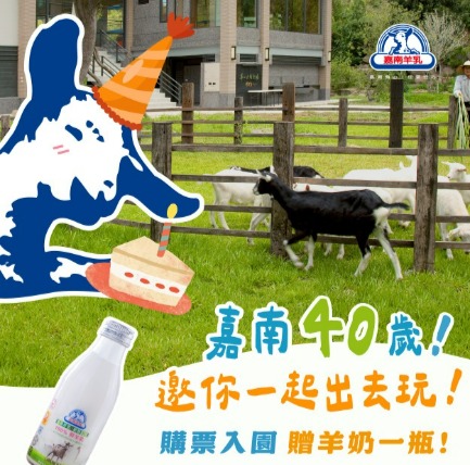 嘉南羊乳 40 歲啦!🎉 這個生日月,嘉南邀請大家一起到我們高雄的觀光牧場--華一休閒觀光牧場來玩,華一牧場遊玩攻略 請點我,來場充滿驚喜的牧場一日遊!不只可以免費喝到一瓶新鮮羊奶,還能玩遍園區的熱門體驗。